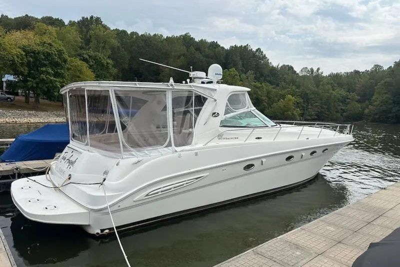 RECENT SURVEY AVAILABLE. UNDERCOVER AND WILL LOOK AT ALL TRADES. KEPT AT EDDY CREEK MARINA. One of the largest domestic express yachts available when she was introduced in 1999, the Sea Ray 460 Sundancer is an impressive blend of American sportboat styling, luxury-class accommodations, and state of the art construction. While the styling was perhaps more conservative than most European express yachts of her era, a wide beam and an expansive two-stateroom, two-head floorplan provide the 460 with cabin dimensions that European imports— with their relatively narrow beams—could only envy. Sea Ray interiors have always been among the best in the business, and the accommodations of the 460 are impressive in every respect. The mid-stateroom, complete with an enclosed head and standard washer/dryer, offers complete privacy behind sliding pocket doors. (Note that the settees in both the salon and mid-stateroom convert to double berth at the touch of a button.) In the cockpit, the facing aft settees convert electrically into a huge sun pad. A gas-assist hatch provides easy access to the engine room. An extended swim platform was standard. Twin 446hp V-drive Cummins diesels cruise in the mid 20s (27–30 knots top).