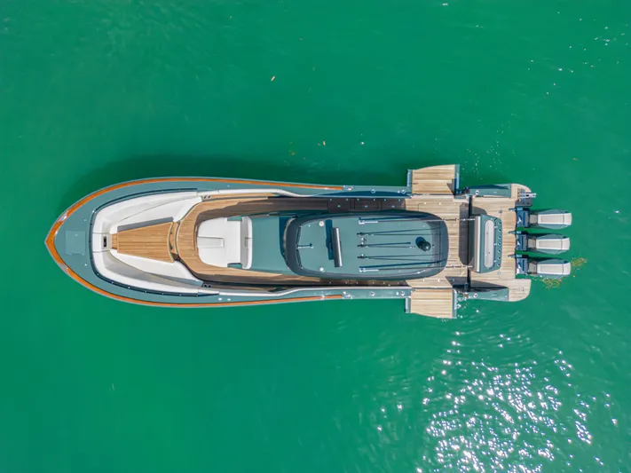 kitchen behind the helm as well as a sliding hi-lo outdoor television, and can easily accommodate a retractable shade at either the helm or the bow, which offers additional comfort and sun protection.