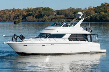 This 2000 Carver 450 Voyager is a well maintained pilothouse motor yacht that has been kept undercover her whole life. She is powered by twin Cummins 450hp Diamond Series diesel engines with approximately 1,500 hours (900 total hp). The ship’s systems are powered by single 50amp shore-power or the onboard Kohler 13kW generator with 1,968 hours.