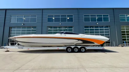 2003 Fountain 47 Lightning, Triple Mercury Racing 525 EFI (502 hull hours – 90 mph – 62 mph cruise) , XR drives, bravo I 32 pitch props, hydraulic steering, seadek flooring, electric bolster seats, Westerbeke gen with 16 hours, hot water heater, electric engine hatches, captains call exhaust, mechanical drive/tab indicators, ProNautic 12.40 battery charger, halon, full mooring cover, cockpit cover, 1997 Heritage triple axle trailer included.  Recent upgrades include indicator cables, fuel pumps and XR drives at 325 hours, top ends, transom at 405 hours. New transom assemblies at 454 hours. New interior and full mooring cover. Recent trailer work: bearings, master cylinder and tires replaced recently.