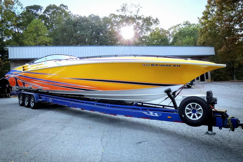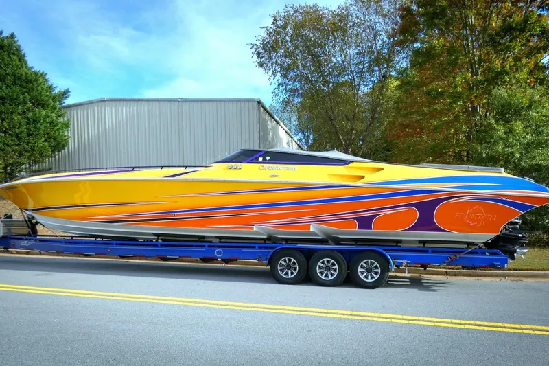 2006 Fountain 47 Lightning powered by triple Mercury Racing 525s and XR Drives with less than 100 hrs. This is a fresh water indoor stored boat that is professionally maintained by Merlin Marine in Buford, Georgia.