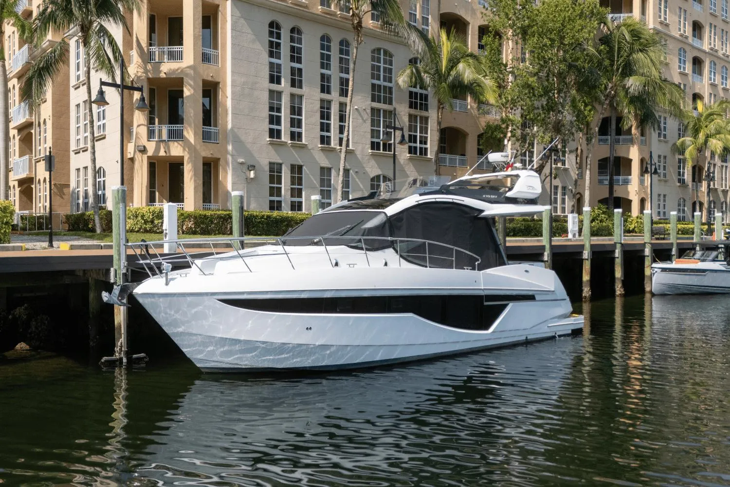 Cruise in luxurious style aboard the 2022 Galeon 470 SKY. This one owner boat with under 250 hours in its Twin 600 HP Volvo Diesel engines, offers great performance and handling. The owner also installed a rear Thruster and a remote-control system to operate the boat standing out of the helm for safe and easy docking . This vessel is professionally maintained and it shows.