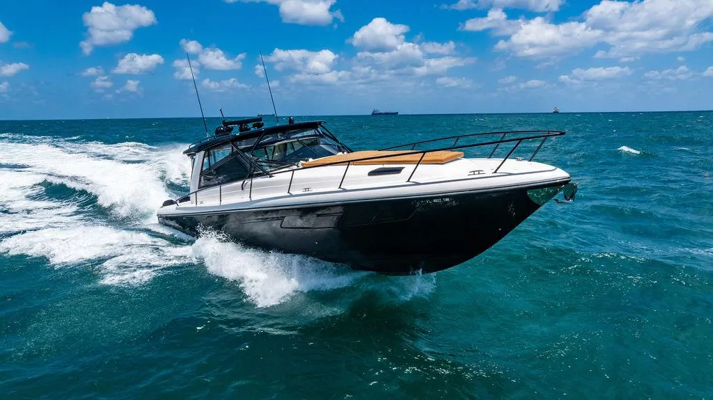 In the summer of 2024 the seller has taken her from South Florida up the Eastern seaboard to the Great Lakes, demonstrating her capability as an excellent choice for those seeking a fast, reliable and low-maintenance boat; suitable for comfortable living and travel. This walkaround model features a spacious cabin with two queen-bed state rooms, a fully equipped galley, and a head with a separate shower. The dining settee seats eight and converts into an additional berth. With her signature stepped hull which is designed for her quad Mercury racing engine configuration, she offers a smooth, dry ride and excellent handling. The 477 is the culmination of 15 years of development and has set a new standard in the Outboard Cruising sector in yachting. This boat is now back in South Florida and ready for more live-aboard adventures.