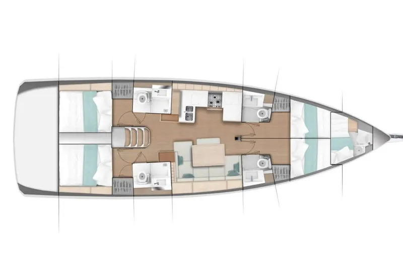 Below deck, four spacious double cabins, each with its own ensuite head, make this yacht ideal for private cruising or charter use. The bright saloon and centrally positioned U-shaped galley offer excellent flow and comfort, whether hosting guests or living aboard for longer periods.