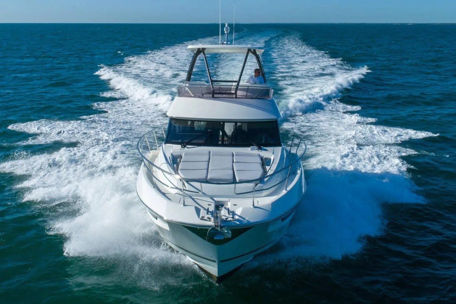 Außen zeigt sie den charakteristischen Stil der neuesten PRESTIGE Yachten, mit einer erweiterten, durchgehenden Fensterlinie im Rumpf. Dieses Flybridge integriert das Konzept des L-förmigen Cockpits, das eine maximale Raumnutzung ermöglicht. Verwandelt in ein sehr großes achteres Sonnendeck, kann dieses Cockpit auch eine voll ausgestattete Skipperkabine beherbergen. Das zeitgemäße Layout der im Heck befindlichen Außenküche öffnet sich zu einer riesigen Badeplattform. Das sehr komfortable Flybridge ist eine Einladung zur völligen Entspannung. An Bord wurde alles optimiert, um unvergleichlichen Raum und Komfort zu bieten. Die Designtalente von Garroni Design und JP Concepts vereinen sich in diesem Flybridge, das alle neuesten Anforderungen erfüllt und alle Vorteile einer echten PRESTIGE Yacht bietet.