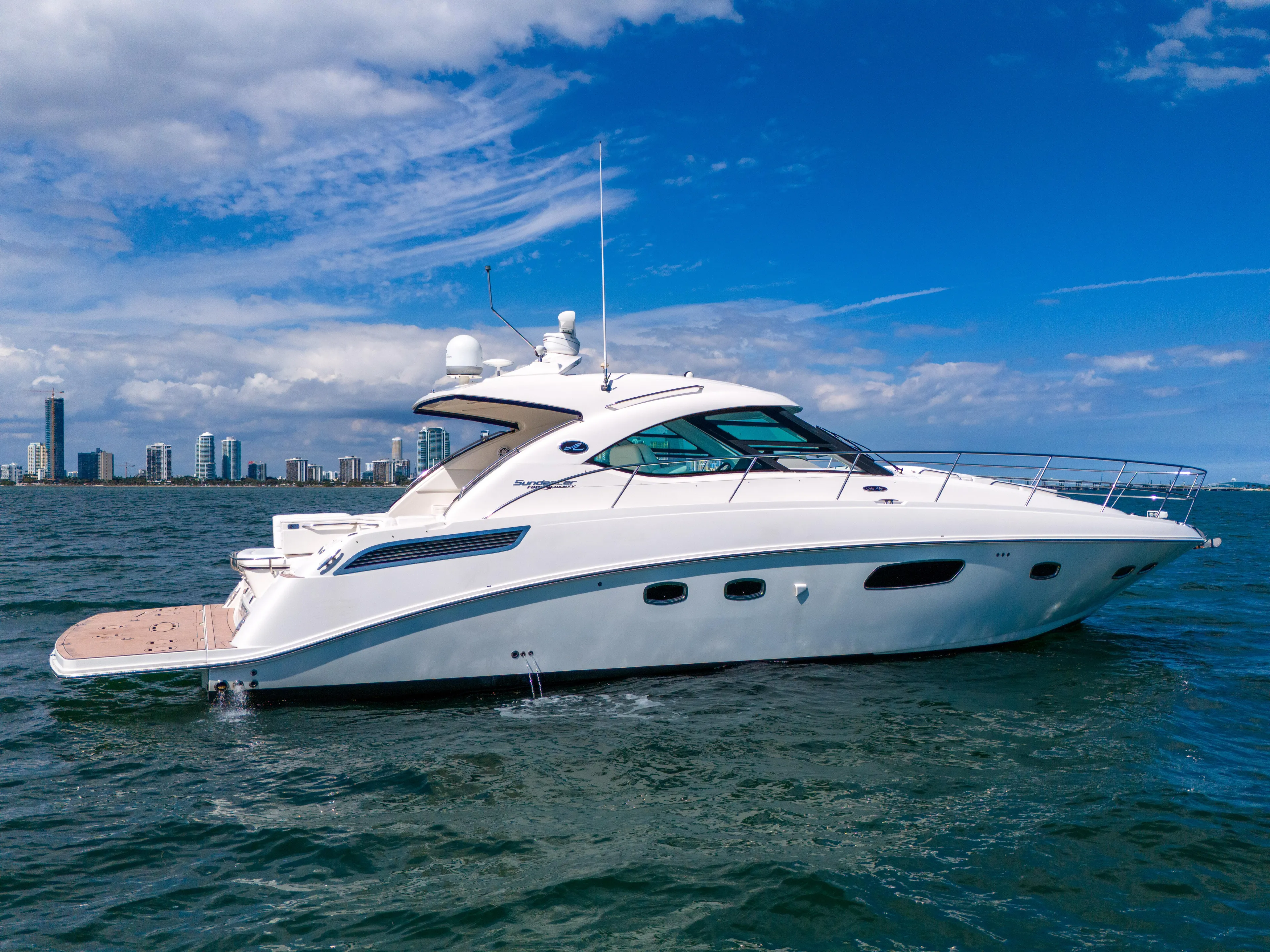 This 47 Sundancer has an exceptional layout and features Zeus 360-degree Control pod drives with an intuitive helm joystick for stress-free docking.