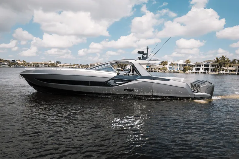 Powered by triple Mercury V12 600HP engines, this sleek machine effortlessly reaches speeds over 50 knots, while remaining remarkably quiet and composed underway. The hull, designed by Michael Peters, ensures superior efficiency and wave-slicing precision in all conditions.