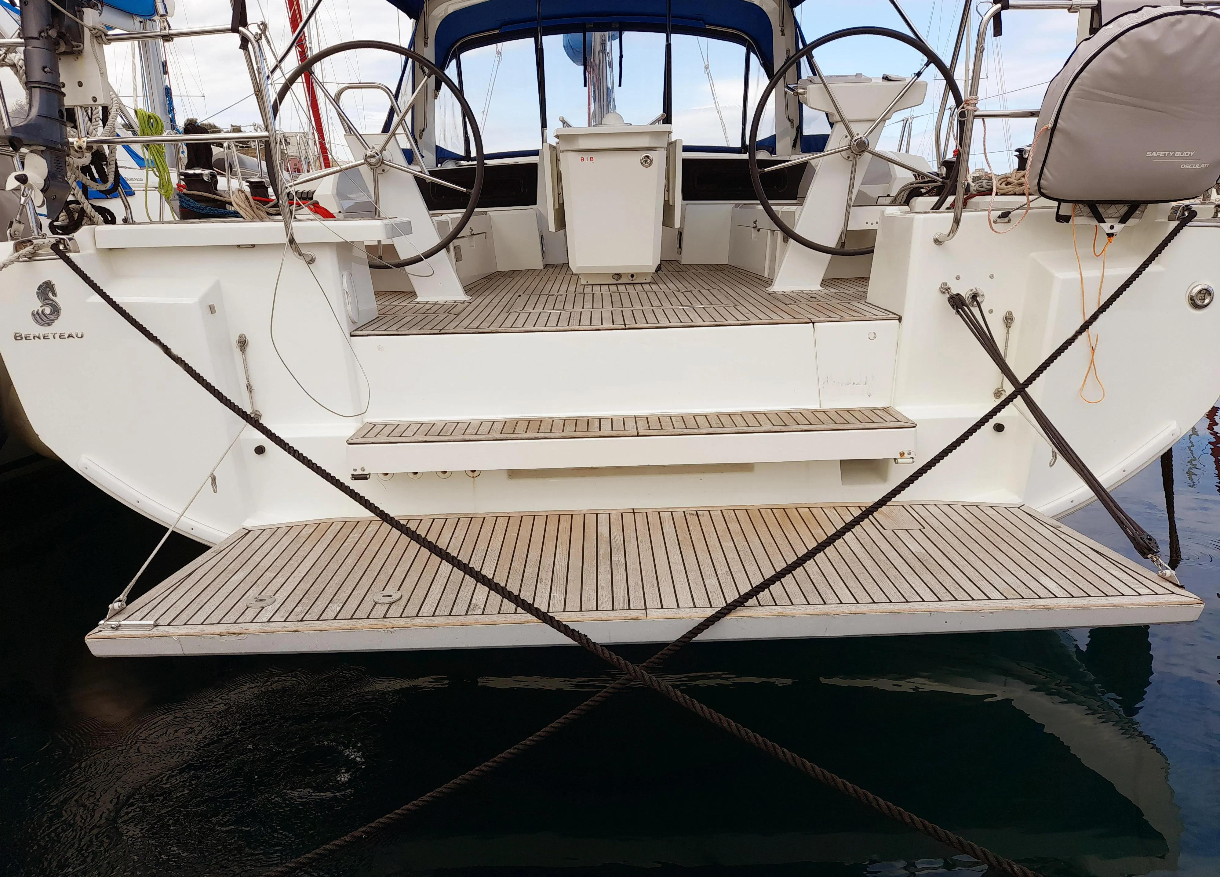 Electric windlass – Bow Thruster – Anchor with 70 m chain – Wheel – Gangway - Tender with rigid keel & two oars - Inflator – Small anchor with 15 m rope - Engine oil container– Bimini top – Sprayhood - Boathook - Fenders - Emergency anchor with 50 m rope – Winch handles - Rope (1X50m; 1x25m; 3x15m) – Bosun’s chair - Bathing ladder – Water hose – Water, petrol, outboard fuel tank, - Gas bottles (Gas included) - Funnel - Bucket – Deck brush – Table – Outside shower - Work gloves - Cable 220V with battery charger – Cockpit cushion – Snorkelling Fins – Cockpit speakers – Wind breaker jacket – Wind Scoop