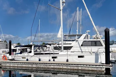 There's an enormous forward master cabin with an island berth and an ensuite head, with a separate shower across the boat from the enclosed head. The twin aft berths have hull and bulkhead ports to allow for light, plus two opening ports that provide ventilation. A generous galley with lots of storage makes meal prep easy.