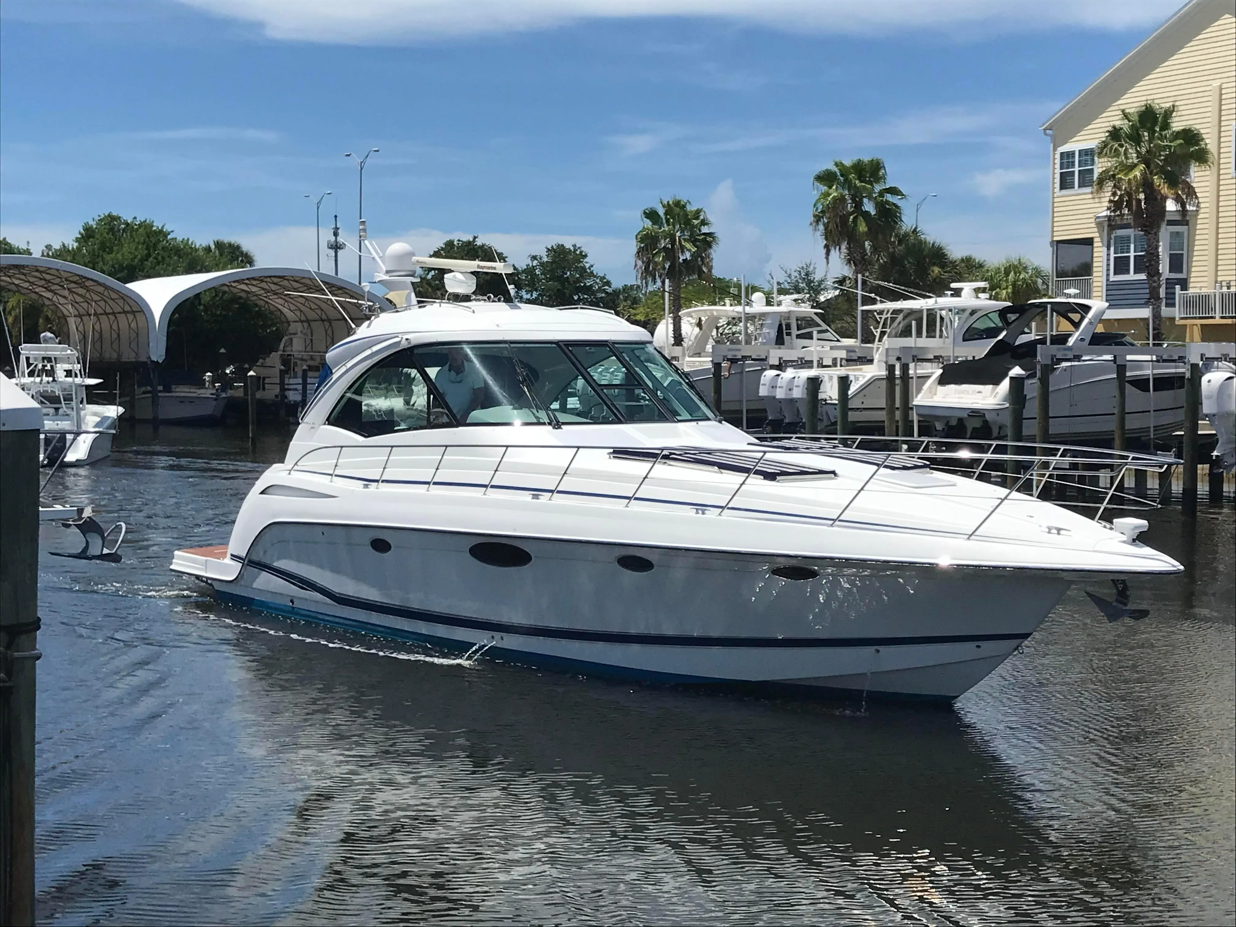 This boat is priced to sell! Welcome aboard this stunning 2007 Formula 45 Yacht. Currently sheltered in a covered wet slip, she is well-protected from the Florida sun. The exterior has just received a comprehensive wax and polish, enhancing her already impressive appearance. The current owner has invested significantly in her upkeep, including remanufacturing both pods, replacing all air conditioning units, installing new bow sun pads, and much more.