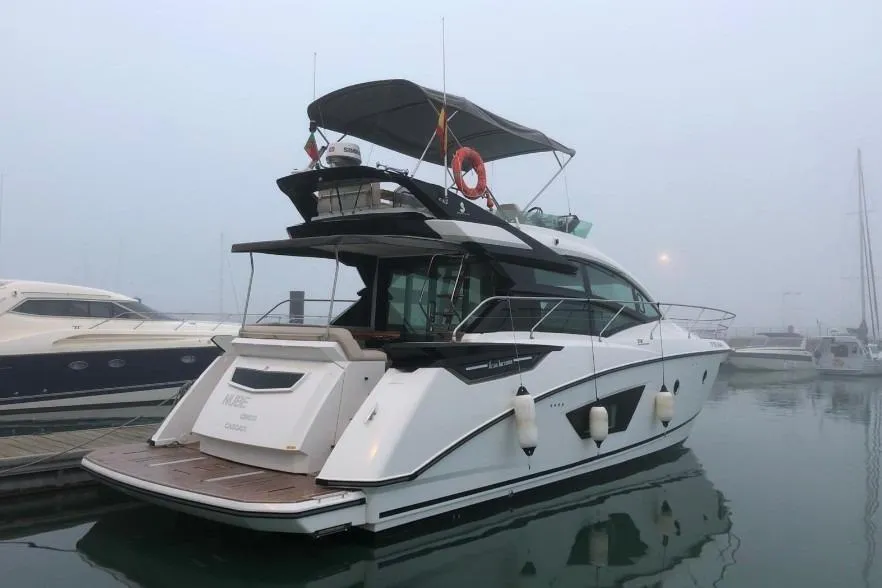 This 2018 Gran Turismo 50 Fly is in impeccable condition, with only 291 engine hours, always meticulously maintained and cared for. Equipped with two Volvo Penta IPS 600 engines (2 x 435 hp), it guarantees agile, safe, and fuel-efficient navigation.