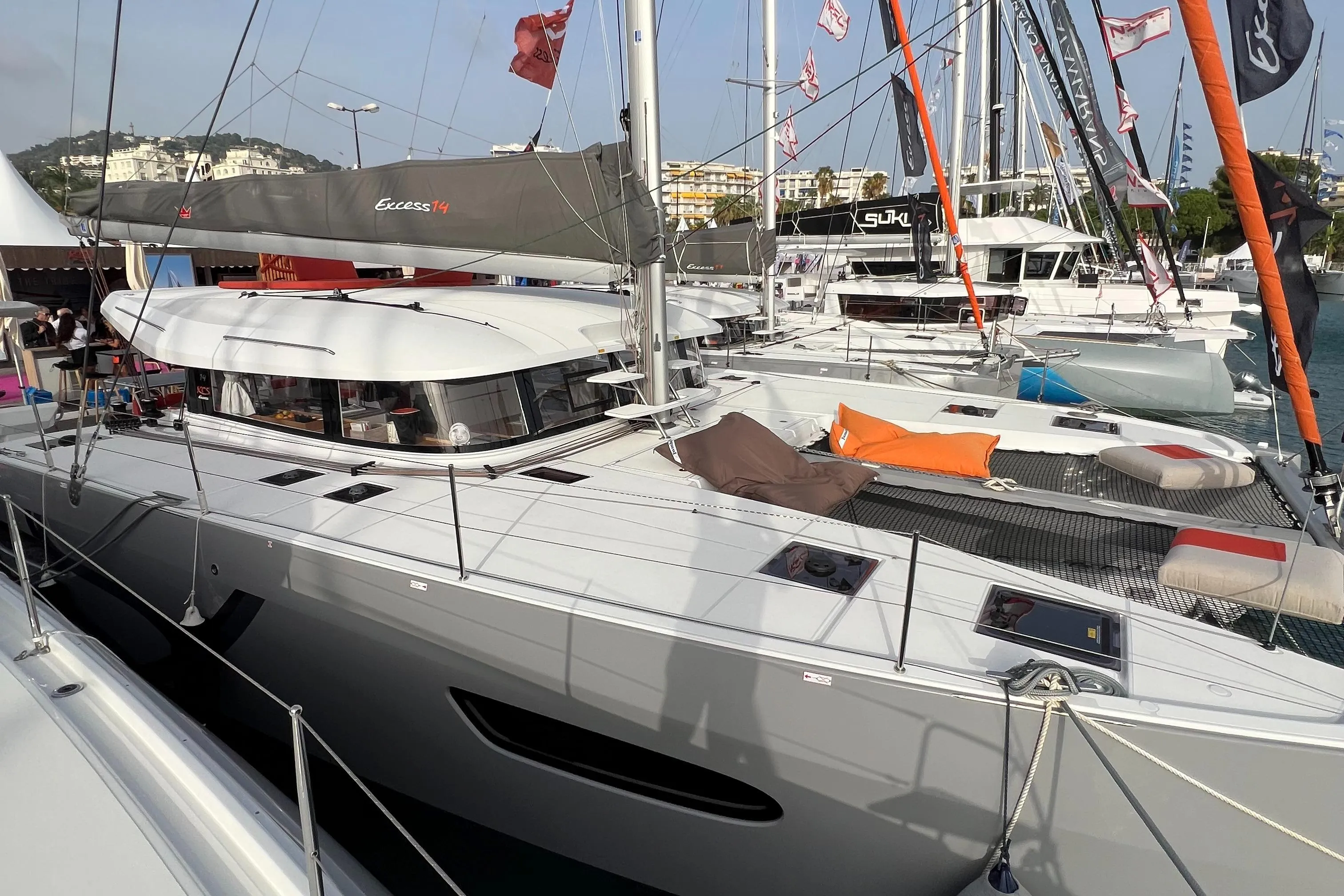 Introducing the stunning 2024 Excess 14 Catamaran, a remarkable vessel that embodies modern design and exceptional performance. With an overall length of 14 meters, this new catamaran is crafted from durable fiberglass, ensuring both strength and agility on the water. Powered by twin YANMAR 4JH57 diesel engines, each delivering 57 hp, it features innovative folding propellers for enhanced efficiency. Experience smooth sailing with a cruising speed of 8 knots and a maximum hull speed of 9 knots, allowing for exhilarating journeys across the waves. The Excess 14 accommodates up to 20 guests comfortably, featuring 34 cabins and 3 heads, making it perfect for both leisure and adventure. An electric windlass adds convenience to anchoring, while the extensive range of 1000 km ensures you can explore far and wide. This catamaran is the ideal choice for those seeking luxury and performance in their nautical endeavors.