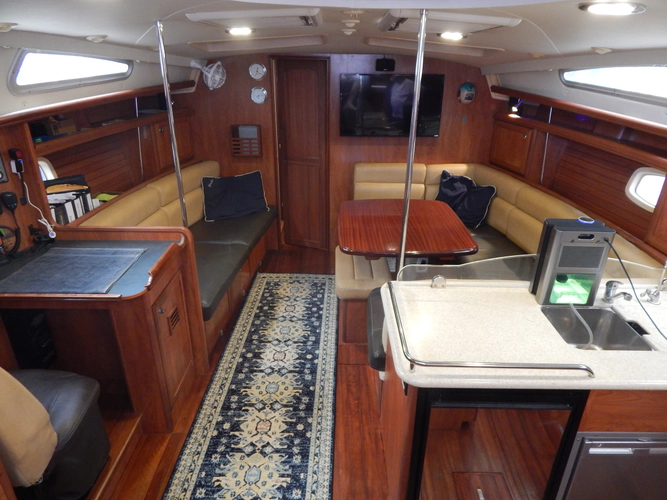 On Port side is the forward facing Nav station and a full length Settee forward of the Nav area.