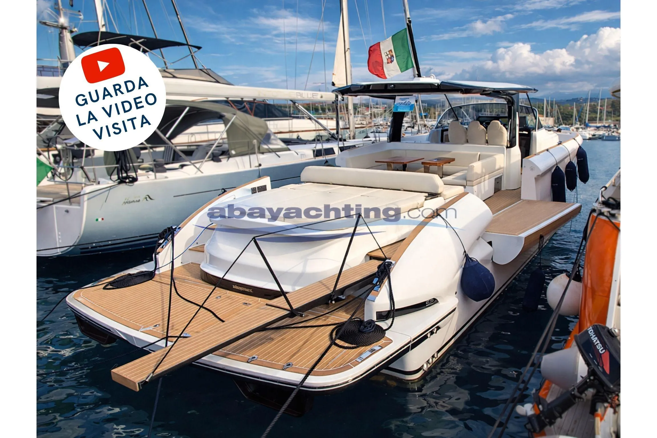 Camminamenti laterali in teak, Caricabatterie (maggiorato), Doccia esterna, Elica di prua - bow thruster, Garage per tender, Luci di cortesia (notturne esterne camminamento), Luci subacquee, Passerella (elettrica telescopica), Piattaforma (Maggiorata con sistema lift), Pompa di sentina automatica, Pompa di sentina elettrica, Porta ingresso, Pozzetto Teak, Presa 220V banchina (a murata), Salpa Ancore Elettrico (Con conta catena), Scaletta da bagno, Tavolo pozzetto (Abbattibile), T-Top