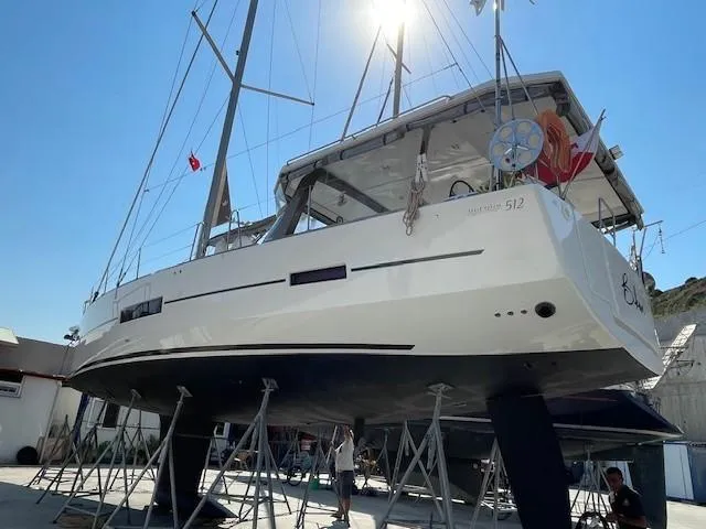 Dufour 512, owners version, with 3 cabins and 3 heads (1 head is used as  a washing & storage room), with Rigid composite Hard-top Bimini, and full facilities including Generator, Air condition, Water maker, Electric winches, Bow and Stern thrusters, washing machine, dish washer, Solar panels, large dingy with console and outboard, and and much more.