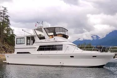 This yacht features two large staterooms one forward and one aft both with Island Beds and Private heads. The aft stateroom features a King Island Bed and the forward stateroom features a Queen Island Bed for your sleeping comfort. The galley is located down with a dinette to the starboard side. This dinette provides ample seating and compliments a full size galley with all the comforts of home. The dinette is convertible to additional sleeping. The salon located up from the galley and down from the Sundeck is large and roomy with an L-shaped settee. The craftsmanship throughout the vessel is of the highest level, finished with a beautiful cherry wood interior woodwork, which compliments the teak and holly floors. The fully enclosed sundeck is easily accesible from the cockpit via a gentle molded fiberglass stairway. You can continue up from the Sundeck to a fully enclosed, hardtopped, heated Flybridge which allows year round yachting piloting from the Flybridge. The vessel is also equipped with a lower helm in the salon.