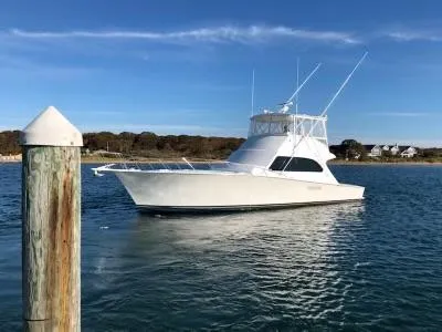 A great-selling boat with over 100 delivered, the Post 50 combines the elegance of a yacht-style interior with the brute force of a well-bred offshore fishing machine. She’s built on a low-deadrise modified-V hull with cored hull sides, a wide beam, and a solid glass bottom. Unlike other Post designs, the 50’s hull is not tapered at the transom that helps account for her very large cockpit. Several three-stateroom, two-head floorplans were offered over the years. Like all Post models, the interior woodwork and detailing are finished to high standards. The cockpit—nearly 150 square feet in size—comes with a full array of fishing gear including a molded tackle center, transom door, and direct access to the engine room (where headroom was dramatically improved in 1995 when the fuel tanks were moved aft). Note that in 1997 the flybridge was widened to the full width of the deckhouse. With the Detroit diesel’s 735hp 8V92s cruise in the high 20s (30+ knots wide open).