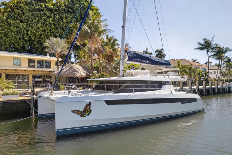 2021 Leopard 50 Owner’s Version is a highly upgraded 4 cabin / 4 head sailing catamaran for sale in Fort Lauderdale. She's designed for serious cruising and luxurious onboard living. Featuring a true owner’s suite, chilled-water air conditioning, a Spectra Newport 1000 watermaker, and an extensive solar and lithium battery system, this Leopard 50 is exceptionally well-equipped for extended time off-grid. Power comes from upgraded 80hp Yanmar engines, while premium interior finishes, including faux leather upholstery, upgraded mattresses, and a fully outfitted galley with washer/dryer and additional refrigeration, elevate comfort throughout. With advanced Raymarine electronics, robust shore power capability, and thoughtful cruising upgrades throughout, this Leopard 50 represents a turnkey opportunity for buyers seeking performance, reliability, and long-range autonomy in a proven blue-water platform.