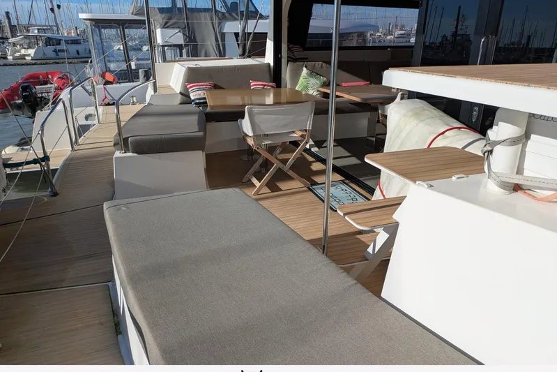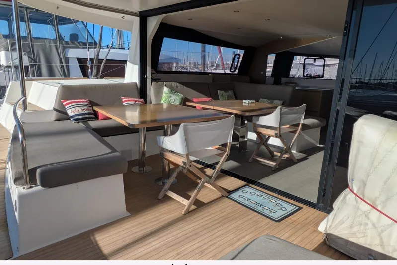 Points forts du bateau: gréement performance avec mât carbone laqué blanc, haubans et bas haubans textiles, enrouleurs électriques génois et trinquette, voiles en Hydranet, belle autonomie avec présence d'un déssalinisateur, d'un groupe électrogène, de panneaux solaires. Table de carré repliable et réglable.