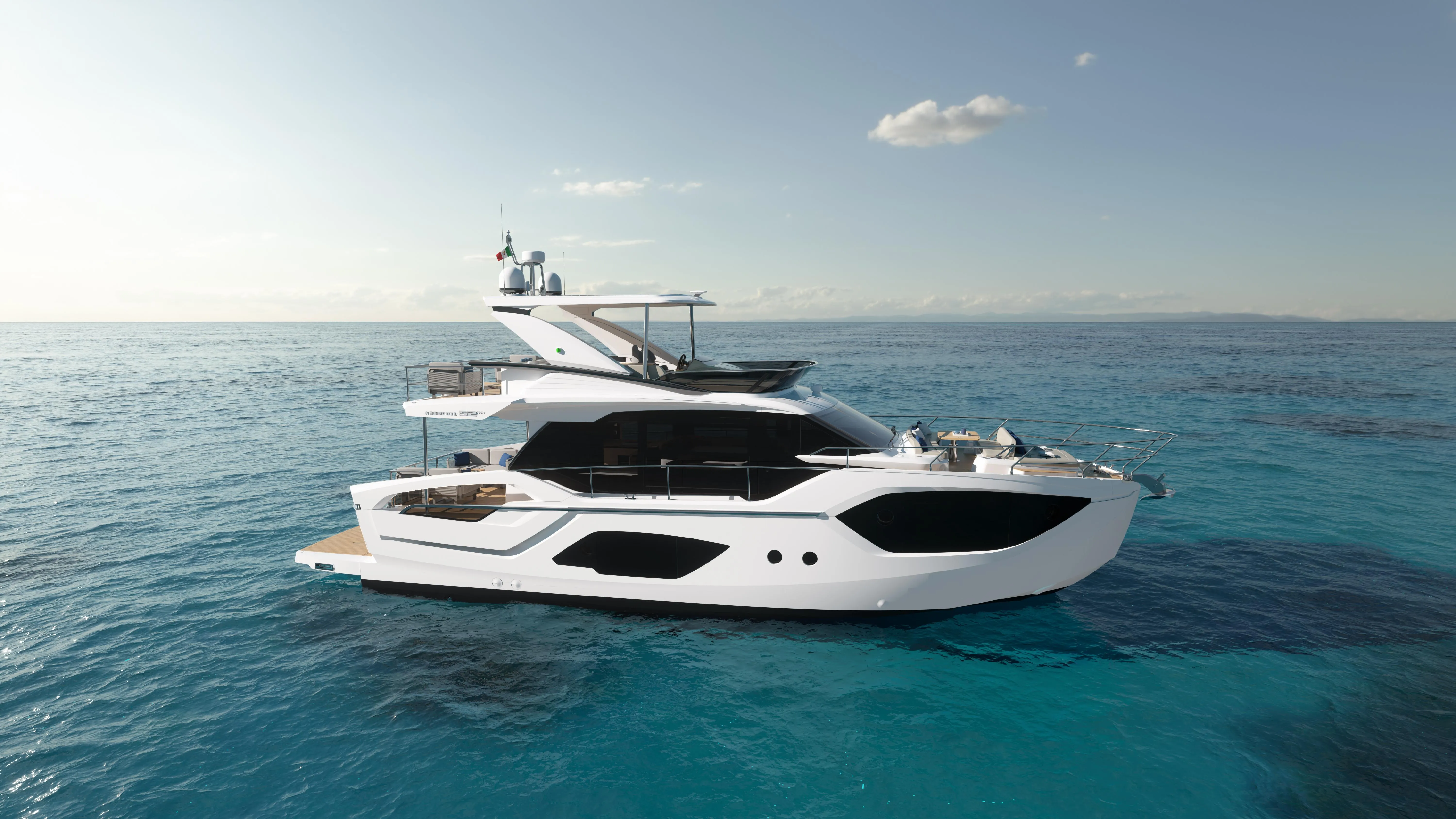 The Absolute 52 Fly has an exclusive combination of user-friendliness, functionality and Italian fashion with terrific outdoor entertaining and lounging 'stations' from flybridge to cockpit, bow to stern and luxurious overnight accommodations for 6 plus crew.