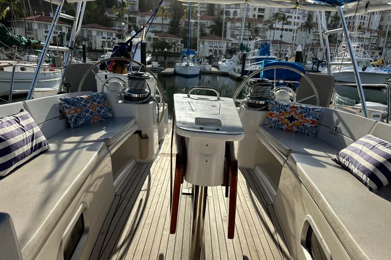 This Beneteau Oceanis 523 accommodates 6 guests within 3 double cabins, as well as a further forward crew cabin. The master cabin is found forward and features a large central double berth, seating area, storage wardrobes and an ensuite bathroom with separate shower area. Two double guest cabins are found aft each with a large double berth and ensuite bathroom. The cabins all have storage under the beds. There is more storage space on this boat than normal. A large U-shaped storage settee with beautiful glossy wood dining table on a stainless steel base to port. The dinette has slip covers that are easy to remove and wash. A straight settee on the starboard side. Aft to port is a large storage cabinet with ice maker. Full beam salon with forward facing nav station to starboard. Galley is to starboard aft with large storage pantry and self unit. Corian countertops in galley with acres of workspace.