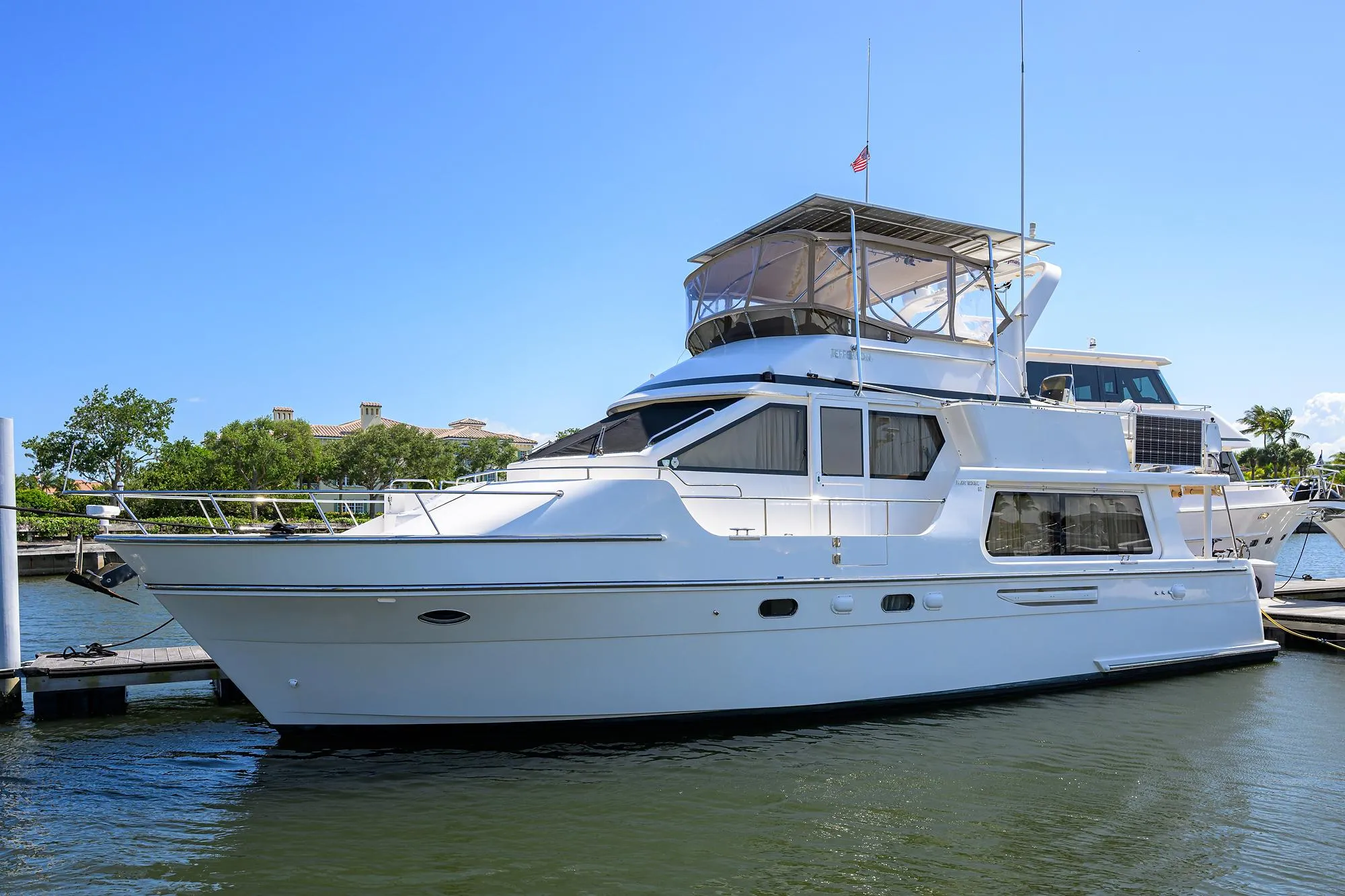 Time Out is a prime example of what it means to be “self-sufficient”. This Jefferson 52 SE is a well-built Pilothouse cruiser. Distinct features such as a Portuguese bridge meet all class standards for space, comfort, and affordability. This Jefferson 52 SE is the ONLY STABILIZED 52 to hit the market!! She also includes a fully functional solar and inverter system that makes her self-sufficient. Upgrades have been made to run HVAC and most appliances without the generator. She has very low original engine hours, and all maintenance records are available. She sleeps (6) comfortably and has two dedicated staterooms, en-suite heads, and showers. Additionally, she features a full rotational davit and dinghy tender.