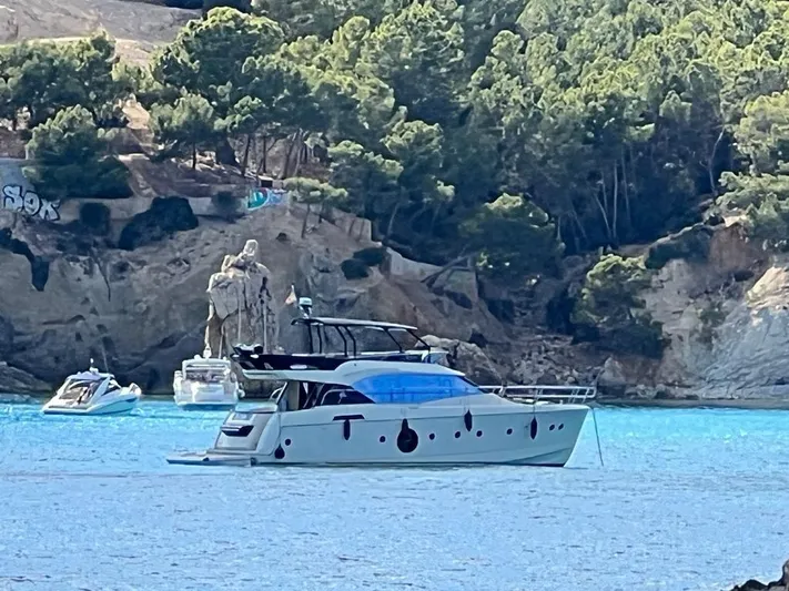 La taille accrue de ce yacht permet d’avoir équipé un flybridge à toit rigide avec toile coulissante, ajoutant de la polyvalence sans gêner l’aspect. Le pont supérieur est complété par un bar - barbecue, un transat, un poste de pilotage avec salle à manger pouvant accueillir jusqu’à 8 personnes, ce qui en fait l’endroit idéal pour les dîners en plein air. Le cockpit arrière est donc moins focalisé, bien qu’une autre salle à manger et la cuisine (juste après la porte du salon) en fassent un autre espace convivial idéal pour socialiser. Le pont avant, inspiré de ses cousins plus grands, laisse la partie centrale libre pour le trou d’homme desservant la cabine VIP en dessous. Deux chaises longues sur les côtés se transforment en canapés et ajoutent encore plus de polyvalence. La plate-forme hydraulique de nage et d’annexe donne accès à la cabine de l’équipage, qui peut être utilisée comme cabine d’invités supplémentaire si le propriétaire est skipper.
