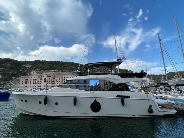 Увеличенный размер этой яхты позволяет оснастить флайбридж с жестким верхом и раздвижным брезентом, добавляя универсальности, не мешая внешнему виду. Верхняя палуба дополнена баром - барбекю, шезлонгом, постом управления с обеденной зоной на 8 человек, что делает ее идеальным местом для ужинов на свежем воздухе. Таким образом, кормовой кокпит менее фокусный, хотя еще одна обеденная зона и камбуз (сразу за дверью салона) делают его еще одним местом для общения, идеально подходящим для общения. Носовая палуба, вдохновленная своими более крупными собратьями, оставляет центральную часть свободной для люка, обслуживающего VIP-каюту внизу. Два шезлонга по бокам превращаются в диваны и добавляют дополнительную универсальность. Гидравлическая платформа для плавания - тендера дает доступ к каюте экипажа, которая может быть использована как дополнительная гостевая каюта, если владелец является шкипером.