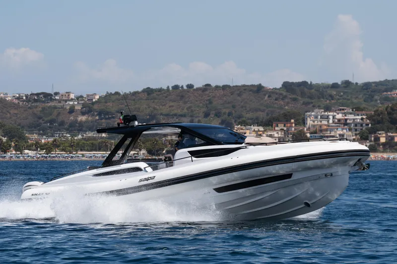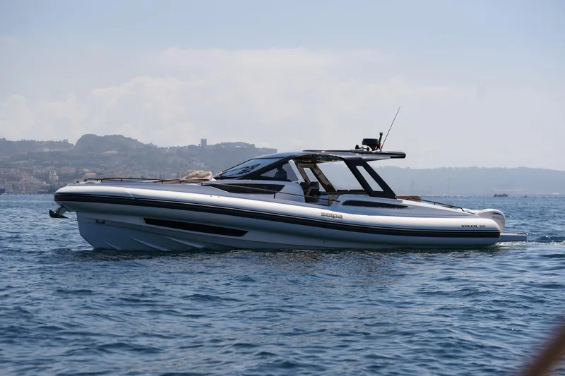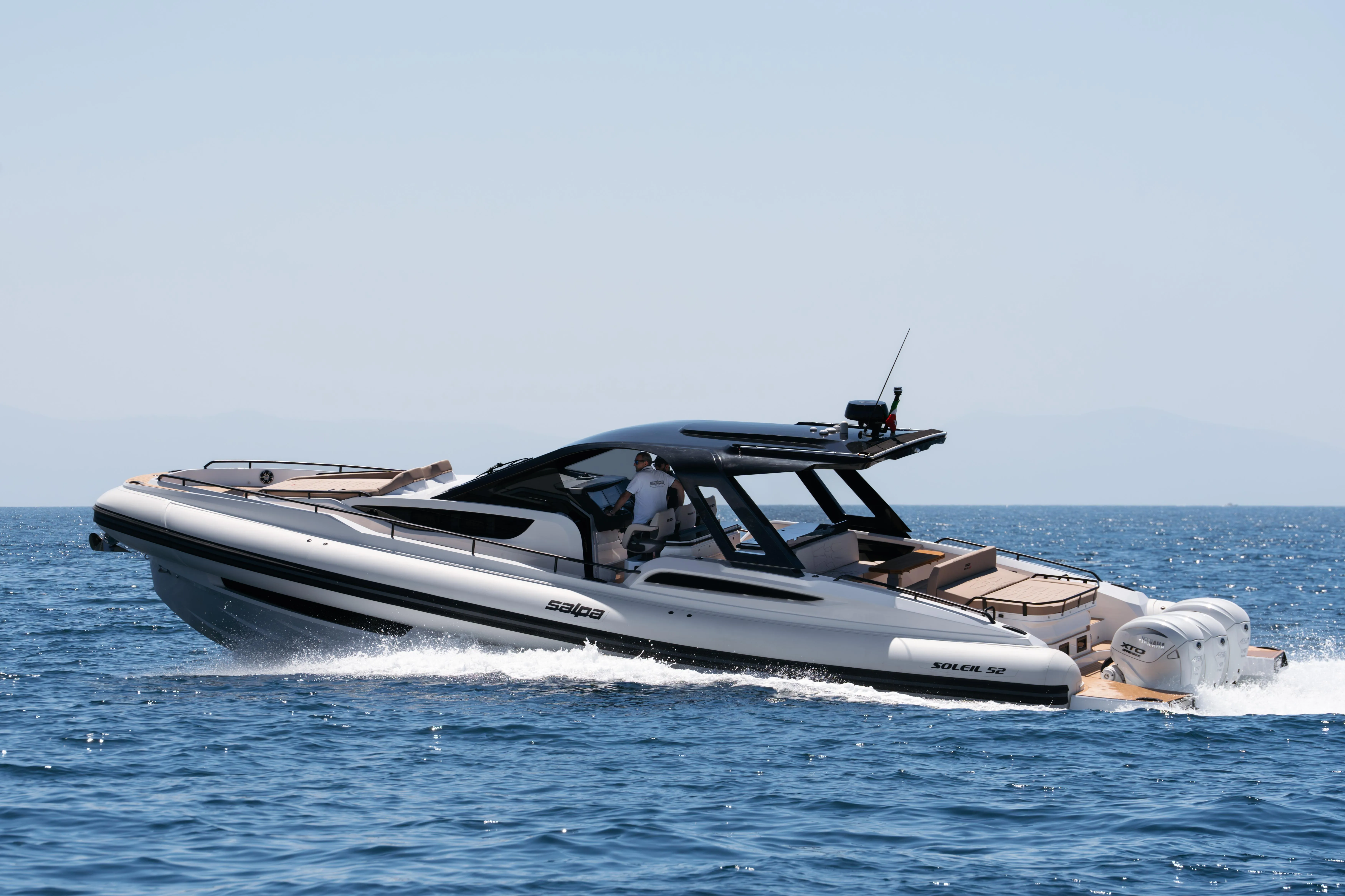 Keywords: Salpa Soleil 52, luxury RIB, high-performance boat, forward sunbed, family boat, comfortable navigation, modern design, 12+ passenger RIB, motorboat, water leisure.