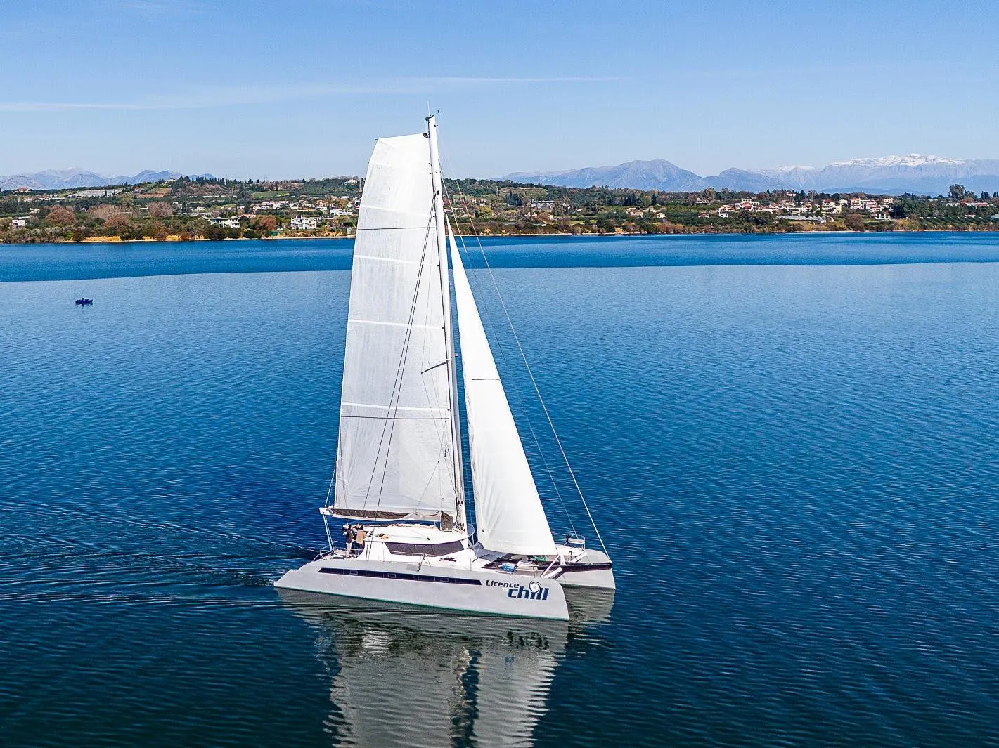ALIBI 54 :For those unfamiliar with the brand, Licence to Chill is an Alibi 54 – a semi-custom, high-performance cruising catamaran designed by a renowned French designer and built in Thailand. This catamaran is crafted for the sailor who craves speed and exhilaration yet wants the comfort and space of a family-friendly yacht. Weighing just 12 tons and equipped with asymmetric push-button daggerboards, a rotating carbon fibre mast, and a brand-new Palma Tec square-top mainsail, she offers both thrilling performance and smooth, predictable handling. Capable of exceeding wind speed with ease, she’s as elegant as she is powerful.