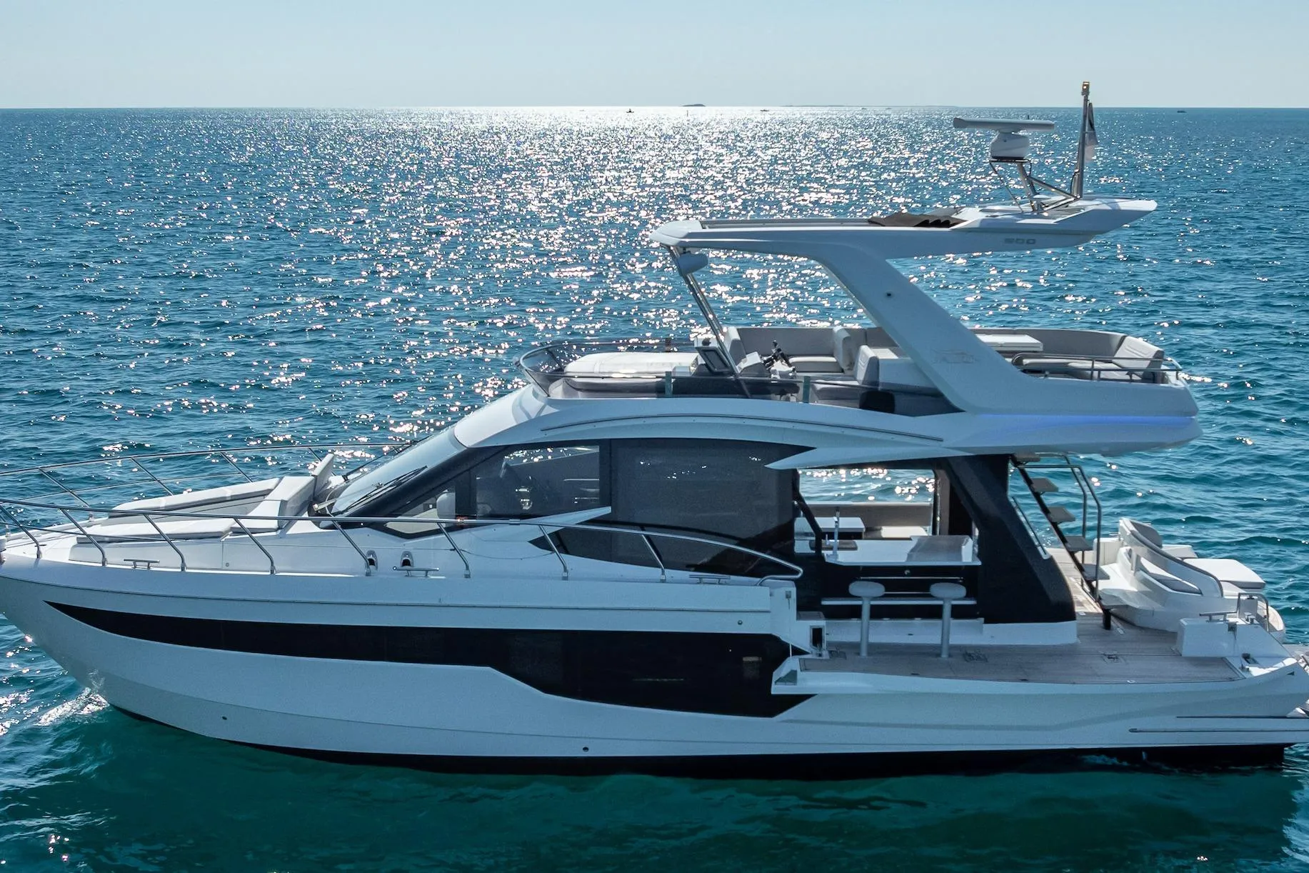 The award-winning Galeon 500 Fly is the most innovative yacht in its class. With all the luxury and craftsmanship that Galeon is known for, the 500 Fly offers ingeniously unique features that make it an incredible investment in your boating lifestyle. With it’s unique “beach mode”, the cockpit width extends to a stunning 20 feet by dropping down both the port and starboard coaming sides.