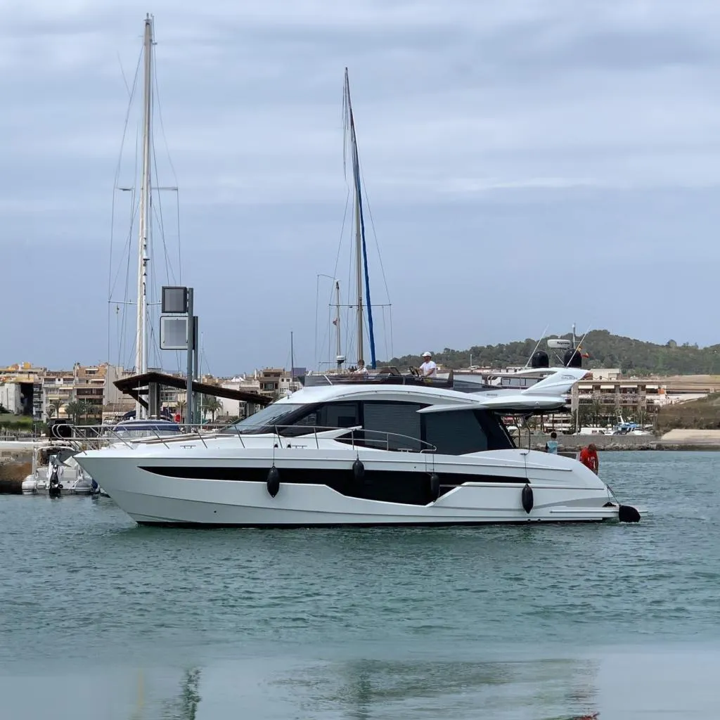 HYDRAULIC BATHPLATFORM WITH TEAK - 500KG LIFTING CAPACITYAIR CONDITIONING SYSTEM (56000 BTU - CHILLED WATER) WITH HEATING INVERTERGENERATOR FISCHER PANDA 15000i (variable rpm model)BOWTHRUSTER WITH JOYSTICKSTERN THRUSTER WITH JOYSTICKLEATHER UPHOLSTERY IN SALOONROMAN BLINDS IN CABINSDECORATIVE BED COVERS AND PILLOWSLED CEILING LIGHTS ON WHOLE BOATLED SKYLIGHTS (EACH)AMBIENT LED LIGHTNING IN MASTER CABINELECTRIC GRILL ON FLYBRIDGE (230V)LED LIGHTS (COCPKIT, STEPS, FLYBRIDGE)UNDERWATER LED LIGHTS (2PCS) - BLUEHYDRAULIC PASARELLE (BOX SYSTEM)AFT MOORING WINCHESCOVER FOR SOFA ON FLYBRIDGECOVERS FOR FRONT WINDOW AND SIDE WINDOWSANTIFOULING (BLACK)TWO EMPTY SAT DOMES ON ARCH PAINTED BLACKRAYMARINE CHARTPLOTTER/FF 2X AXIOM 12 RV-EU WITH TRANSDUCER B744V ANDDIGITAL RADAR RD424 HDRAYMARINE VHF RAY91 AIS (RECEIVER) AND VHF ANTENNA WITH REPATER ON FLYRAYMARINE AUTOPILOT EV-1 ACU200 WITH 2XP70RS CONTROL UNITSATELLITE TV RAYMARINE STV45 + EMPTY DOMEREAR VIEW CAMERA + ENGINE COMPARTMENT CAMERA (2 UNITS)FUSION UNIVERSAL DOCK FOR SMARTPHONE