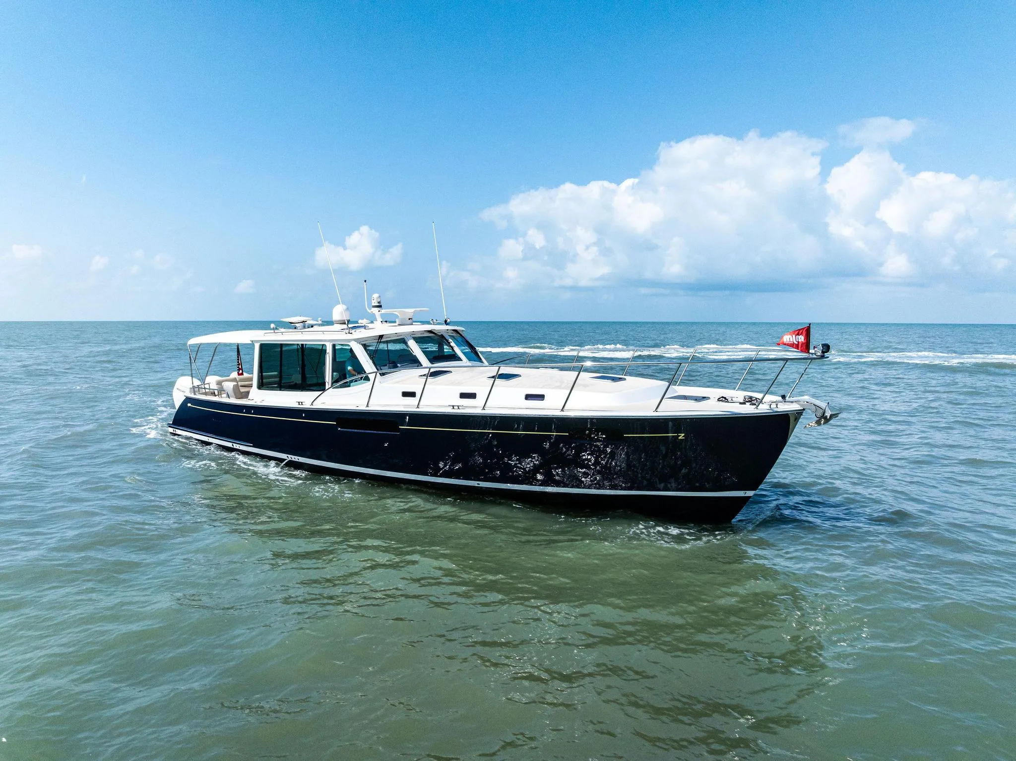 This 2022 MJM 53Z Galati Yacht Sales Trade presents a rare opportunity to own an outstanding one-of-a-kind vessel — She is the only 53Z that has been built with triple Mercury Verado 600HP engines. This exceptional power package paired with her Doug Zurn hull shape delivers exhilarating performance and a soft, stable ride that is surprisingly quiet. The cockpit provides a welcoming space with an aft settee, lounge chairs, a teak table, and dual dive doors, while the pilothouse features air-conditioning, a U-shaped lounge, and a 32” drop-down TV for added comfort.