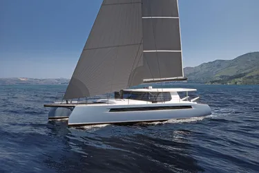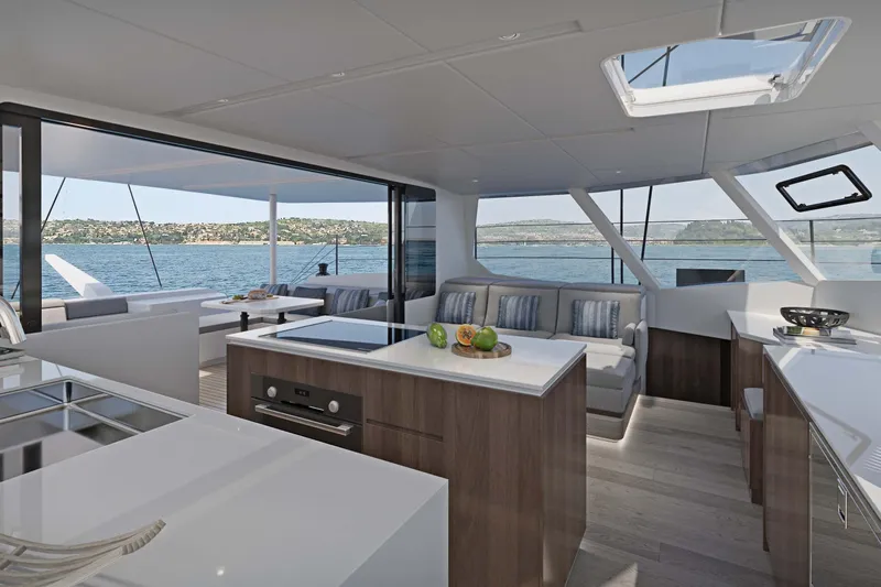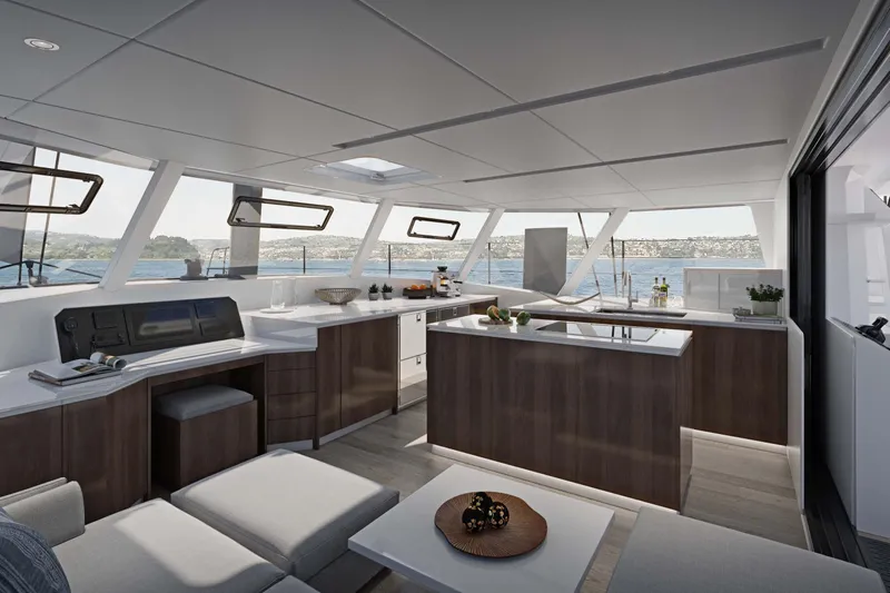 Energy efficiency is central to the design, with optional diesel-electric hybrid propulsion, high-output 48-volt charging, and up to 3,000 watts of flush-mounted solar integrated into the coach roof. Exceptional natural ventilation, expansive visibility, and thoughtful storage throughout complete a catamaran that delivers true long-range performance voyaging—fast, gracious, and effortlessly balanced.