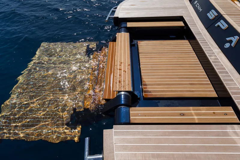 The passengers dive effortlessly into the water from wherever they are by walking on to the side platforms which electronically open and close at will. Freedom is at your fingertips as you can double the beam of the Continental 54 with the push of a button. When it is too warm to lounge outside, the optional stern platform unfolds into the water creating a majestic beach club worthy of a megayacht. The platform may also be used to allow passengers to walk on and off, rather than jump or climb onto and off the yacht, resulting in a comfortable and safe experience for guests of all ages.