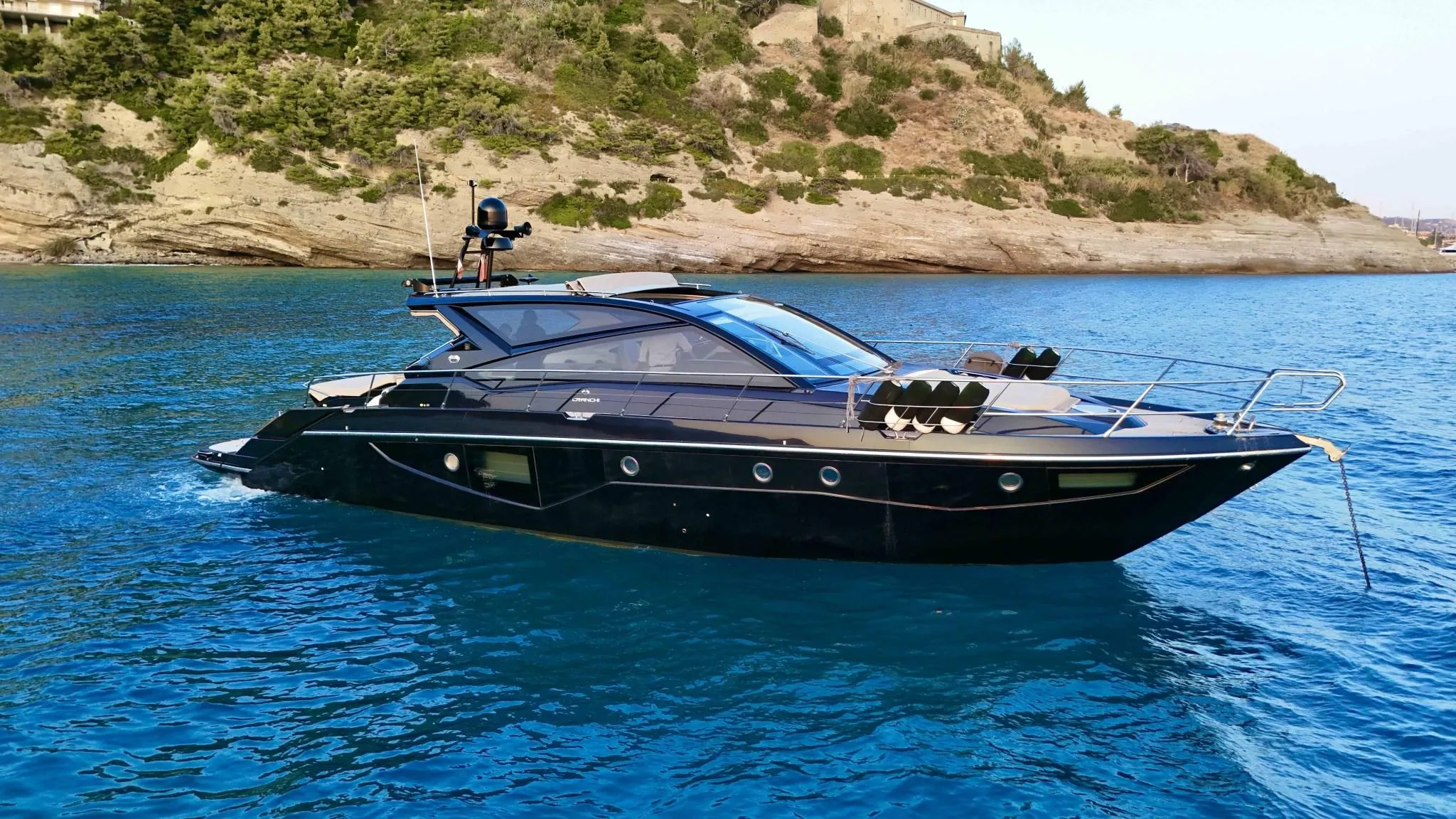 No need to say she's mystical and intriguing; her dark shiny black hull and superstructure makes her the sole Cranchi60 ever produced in this intriguing livery.