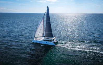 The MKII introduces more versatility into this range with semi customizable layouts to suit most needs. The 3-cabin version features an intentionally open starboard aft cabin. This purposeful design allows for a multitude of possibilities, freeing up the space for owner customizations. The model features a stylish saloon, incorporating a large Corian and bamboo galley with ample storage. There is also a 4-zone induction cooktop paired with electric oven. A dual sink, microwave, storage for appliances and bar seating for 3 rounds off a fully functional kitchen with panoramic views to match. There is also generous seating arrangement in the saloon with rear bulkhead mounted popup 40inch television. The galley table can also be converted into a full-size queen bed, perfect for overflow guest accommodation, kids’ area or comfortable location for long voyage navigations. There are two large sunroofs on the saloon cabin for additional lighting with great visibility of the mast and sails.