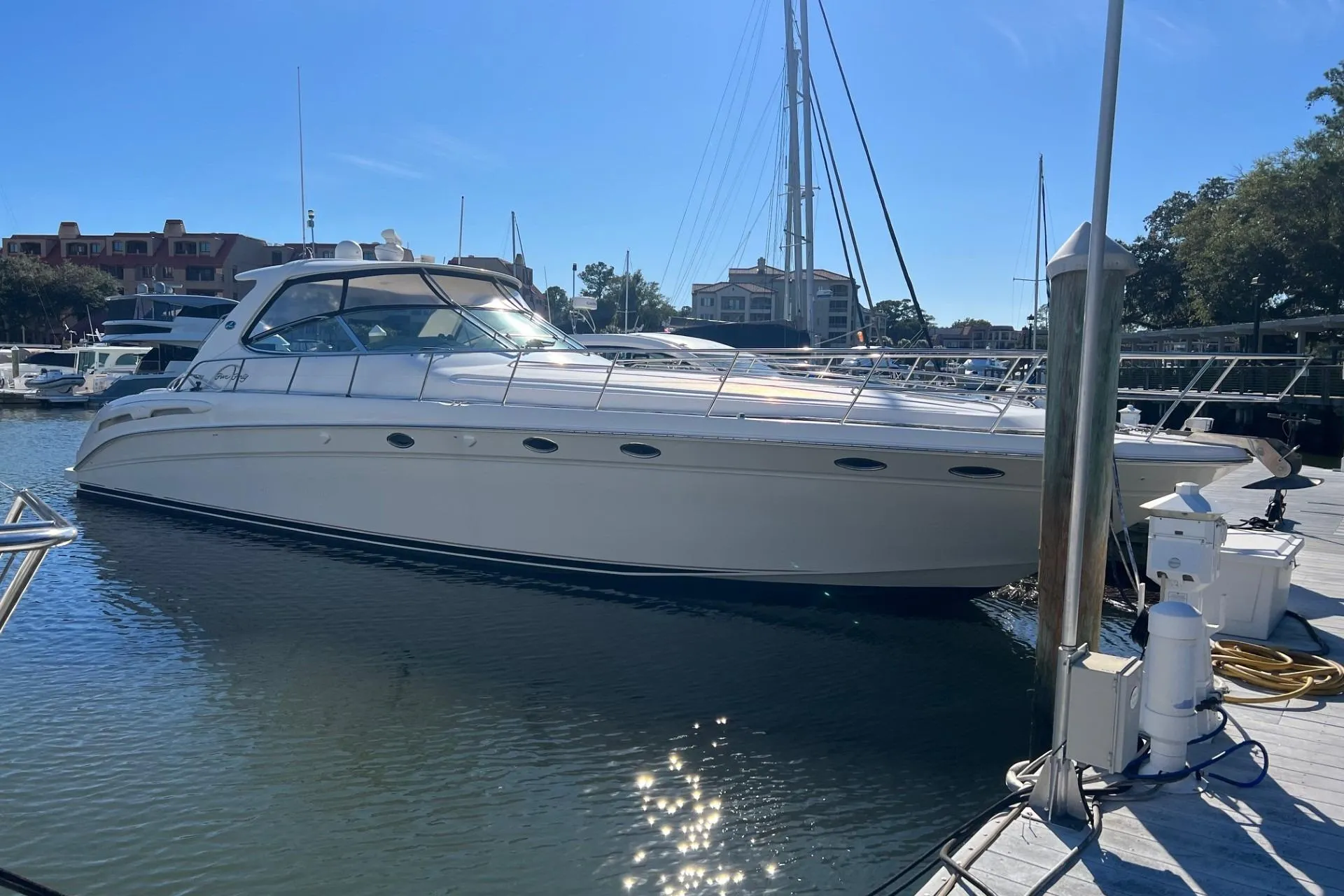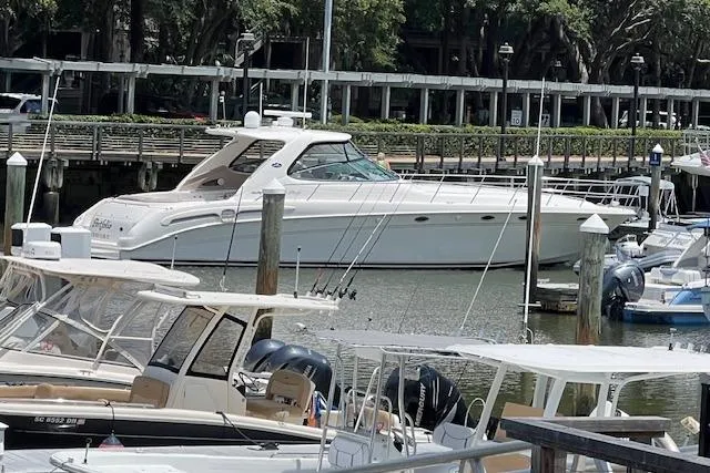 Beautiful Example of a Very Special Sundancer Model * The 540 is Equally Impressive Inside and Out * Offering a Plush and Spacious 2-Staterooms / 2-Heads Interior Layout as well as a Huge Air Conditioned Exterior Cockpit with Abundant Seating Roomy Enough to Entertain a Crowd * Two Large L-Shaped Settees in the Cockpit Electrically Convert to an Immense Sunpad * This Luxury Cruiser is Loaded with a Fiberglass Hardtop * Canvas Enclosure * (4) Heat/Air Conditioning Units to Include Exterior Heat/Air Conditioning * Cockpit Wet Bar with Refrigerator & Ice Maker * A Practical Yet Plush Salon Featuring a Gigantic Curved Leather Sofa that Converts to a Double Bed * Hardwood flooring * Large Master Stateroom Aft with Ensuite Head and Separate Shower Stall * Full Galley * Guest Quarters are Forward with Their Own Private Entry to the Guest Head with Separate Shower Stall * High-Gloss Cherry Cabinetry Throughout * Powered by Desirable Twin 660/hp 3196 Caterpillar Diesels with Only 875 Original Hours * Westerbeke 12.5 KW Generator Housed Within a Sound Enclosure (1850 Hours) * Spare Propellers * Fresh Antifouling Bottom Paint * Beautiful Condition * Please call for additional information.