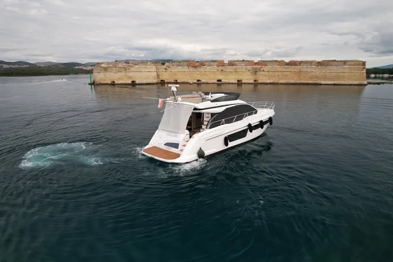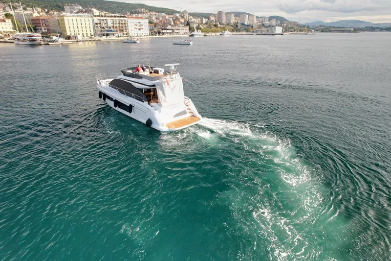 Azimut 53 Fly is spacious flybridge yacht with 3 cabins and additional big convertible bed in saloon where you can easily sleep additional 2 adults or 3 children. In every cabin and saloon you will find smart tv. Master cabin and saloon are also equipped in soundbar and subwoofer audio system. Yacht is equipped in almost all factory options like: hydraulic platform, hydraulic gangway, tropical air conditioning system, generator, hydraulic bimiini top on fly, skipper cabin (storage room here), full kitchen appliances (big fridge with freezer, ice-maker, coffee machine, oven, induction cook-top, Azimut glasses, plates and cutlery). On flybridge you will find additional fridge, electric grill, sink, ambient led lights and separate audio system with 4 speakers.