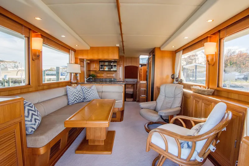 Entering from the aft cockpit deck you are immediately greeted with a spacious salon. Featuring the timeless appeal of teak cabinetry, vast windows, teak sole with holly accents, and most importantly, an interior layout that balances form with function. This layout allows for an open social environment while keeping the function of the galley separated from the rest of the salon. With a 16’ beam, this open floor plan makes entertaining guests an effortless endeavor.