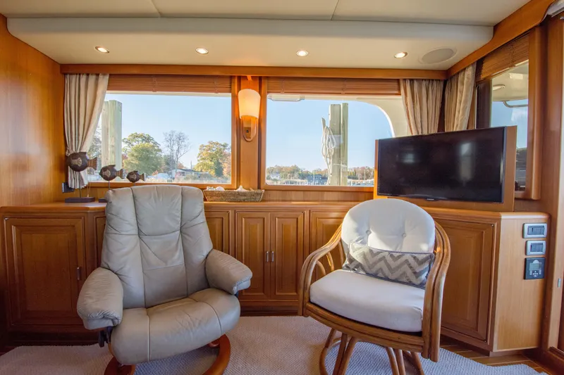 Visibility forward and wrapping around to port and starboard windows is excellent. Below the expansive windshield are consoles which provide ample room for a full range of modern electronics and equipment without intruding on the engine instrumentation. Overhead consoles provide additional space for equipment within easy reach. Both AC and DC electrical breaker panels are below the console to either side and can swing out to provide access to wiring connections and backside of displays. There is a proper chart area to the starboard side with large drawers for maps, cruising guides, navigation instruments, binoculars, and other necessities. Centered along each port and starboard side of the pilothouse are sliding doors that lead out to the side Portuguese decks. To the aft of the port side-door resides a raised L-shaped settee and table which provides a comfortable social area with phenomenal visibility while underway. Aft of the starboard side-door you will find additional storage through a hanging locker and extra drawers. A large stainless steel teak-accented destroyer wheel and Stidd helm chair finish off the pilothouse and perfectly accent this ultimate cruising yacht.