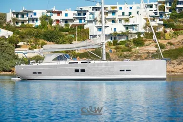 Scafo grigio in gelcoat, interni chiari, 3 cabine matrimoniali più cabina letti a castello, 2 bagni, cabina marinaio completa di servizi, tappezzerie interne ed esterne rifatte nel 2023, elettronica B&G completa, randa triradiale full batten 2023, fiocco avvolgibile autovirante 2023, plancetta idraulica, passerella in carbonio