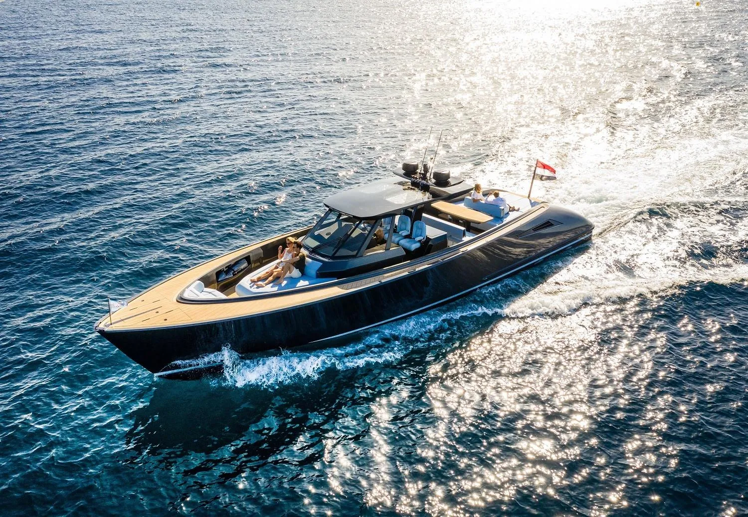 The Wajer 55 S adopts a centre console configuration, providing a smooth flow of traffic on deck and a passenger-friendly space. The deck is equipped with a hardtop with removable panels, which can be extended to provide shade for the lounge area located aft of the captain's seats. The yacht also has a hydraulic bathing platform for easy access to the water.