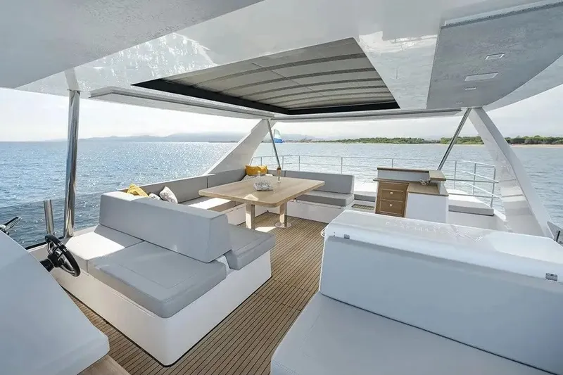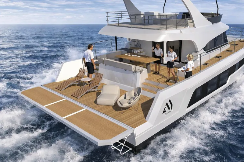 Avec l’A56MY nous améliorons les performances en proposant des moteurs plus puissants jusqu’à 2x550ch, nous redessinons les coques pour une navigation plus confortable et bonifions l’espace extérieur en créant une immense plage arrière aménageable digne des grands yachts de luxe; du jamais vu sur un bateau de cette taille.