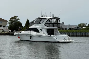 The Sea Ray 560 Sedan Bridge is a solidly built boat with a wide beam that provides a spacious interior. She has three staterooms, two heads, and a comfortable salon inside. Outside there is a cockpit with a hydraulic swim platform, and a flying bridge with a hard top. This vessel has been very well kept and maintained by current her owners.