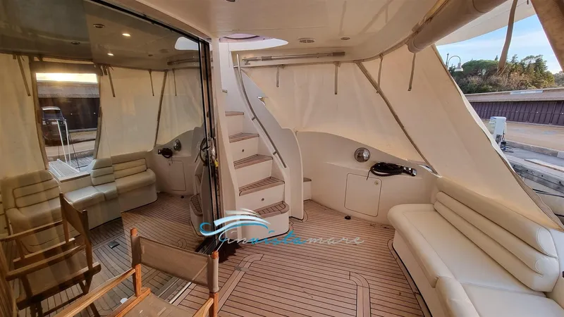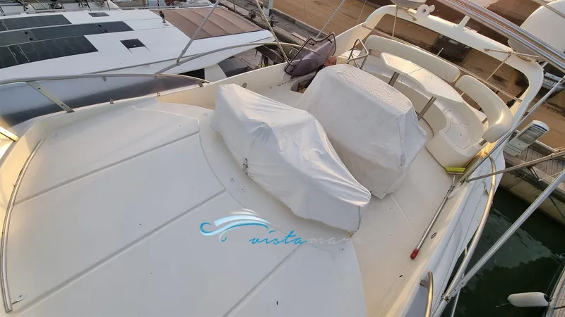 Allarme motore, Allarme sentina, Ancora, Autoclave, Autogonfiabile, 10 Batterie (2 motori 8 servizi), Doppia timoneria, Fari fissi a poppa, Flap idraulici, Impianto antincendio, Indicatori Flaps, Lavaggio catena, Luci di cortesia, Luci subacquee, Piattaforma, Pompa di sentina automatica, Porta ingresso, Presa 220V banchina, Presa acqua banchina, Raddrizzatore, Rollbar, Tromba, 2 Winch, Winch tonneggio di prua.