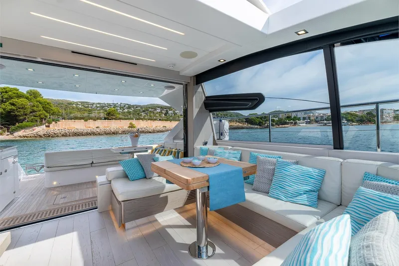 When the large saloon doors retract, the cockpit seamlessly extends the interior into an open-air living space. With the hardtop also retracted, the area becomes a true outdoor lounge. The teak deck features a leather sofa and dining table to port, while to starboard a barbecue and bar add to the social atmosphere. A spacious aft-facing sunbed completes the setting.
