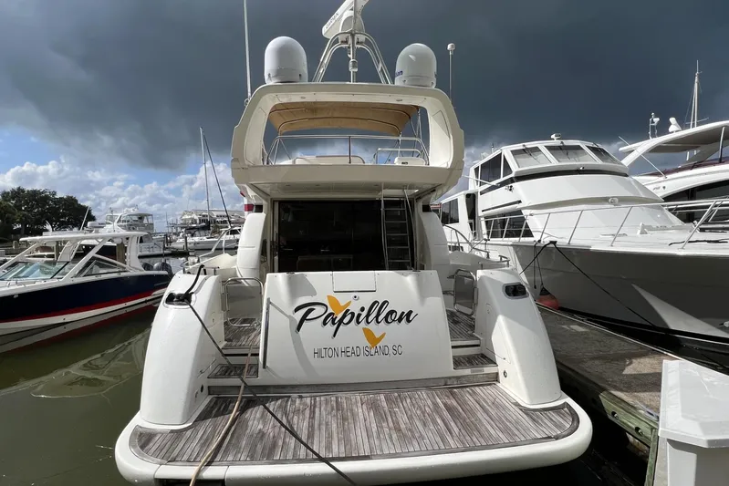 Boarding is made safe and easy by way of the extended aft swim/boarding platform.  From here one finds easy access up to the cockpit/aft deck through transom gates on either side.  The aft deck itself offers port and starboard sidewalk access to the foredeck where one finds a large double-wide sun pad.  The teak decking on aft deck and swim platform add the perfect touch.  The aft deck also provides secondary in-deck hatch access to the engine room, ladder access up to the spacious flying bridge and forward-facing bench seating with lazarette access beneath.  Passerelle boarding is also accommodated with a built-in (hidden) gangway attachment and step.  The extended fly bridge overhang gives partial cover to the aft deck below and there are warping (docking) winches in each aft corner.