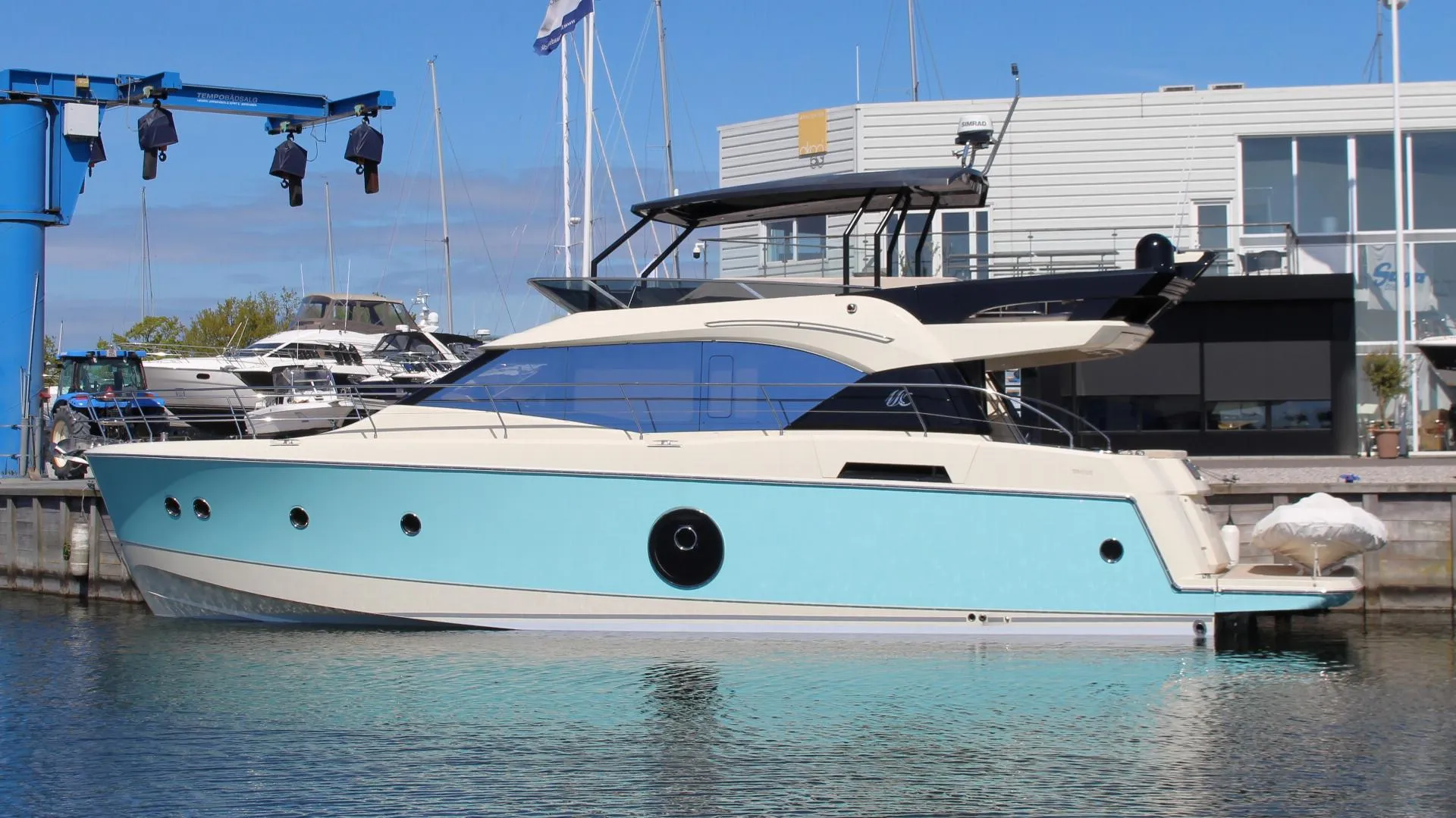 Beneteau Monte Carlo 6 som er 60 fod har et smukt og moderne design. Udstyret med to Cummins 600 hk - diesel motorer når Monte Carlo 6 en topfart på 28 knob. Denne båd er i super flot stand, og er en af de få til salg i Europa. Bør ses. Den har altid været dansk ejet og stæet indendørs om vinteren. Den er apteret i lys egetræ. Med joystick styring fra salon, flybridge og agterdæk er båden nem at håndtere og sejle i havnen. Indretningen er med meget stor og åben salon med integreret pantry og styreplads. Sofa ved spiseplads kan omdannes til stor dobbeltseng, lille spiseplads til bagbord, som kan også omdannes til enkeltseng. Det giver 10 sovepladser i alt sammen med crew cabin agter. Fra styrepladsen er der en stor dør på styrbord side som giver nem afgang til sidedækket. Fra sidedækket er der en dør som gør det nemmere at komme i land når man ligger langskibs. Stor owners kahyt midtskibs med separat brusekabine og toilet. Stor dobbeltkahyt foran, 3. kahyt med køjesenge til bagbord. Begge kahytter deles om det store badeværelse med brusemulighed til styrbord. Dejligt sol område på fordækket. Flybridgen har masser af siddepladser, meget overskuelig styreplads med nem betjening af alle instrumenter og motorerne. Den elektriske grill og køleskab med vask gør det muligt at bruge mange timer på flybridgen under biminien. Cockpittet kan nemt dækkes ind med kalechen. Der er også monteret hydraulisk landgangsbro og badeplatform.