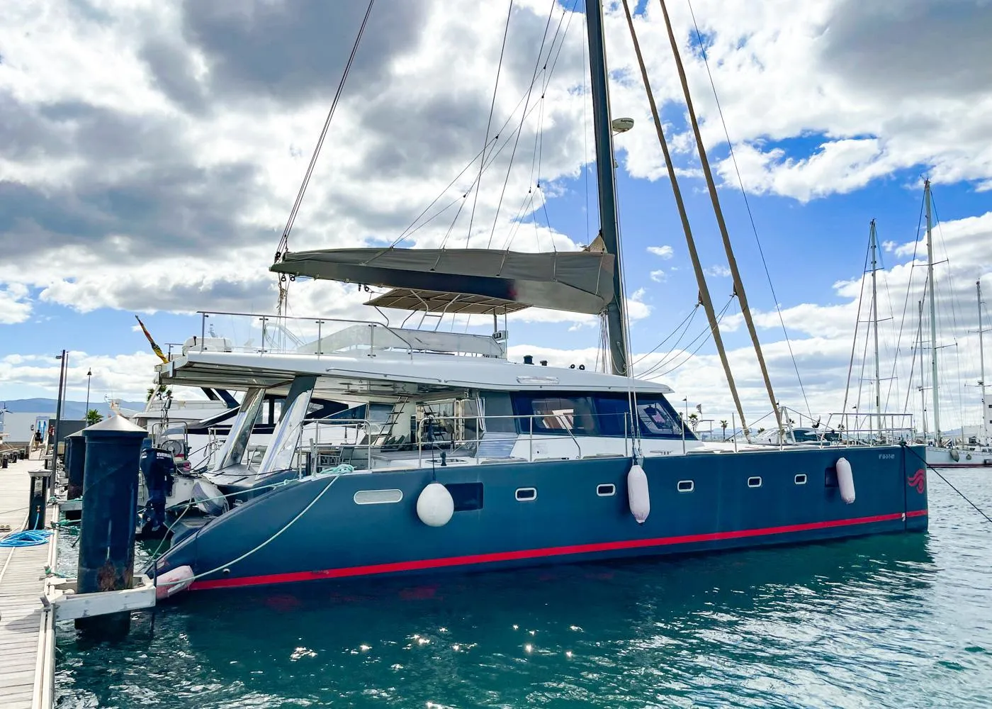 Im Außendesign stechen der beeindruckende 30-Meter-Mast aus Karbon und die Verbindung der Kufen, die ebenfalls aus Karbon bestehen, hervor. Im Vergleich zu anderen Katamaranen besteht die Rumpfstruktur zu 30 % aus Verbundwerkstoff, was für mehr Sicherheit und Stabilität sorgt. Das geräumige Cockpit und die Flybridge sind mit komfortablen Sonnendecks ausgestattet, die auf dem gesamten Boot zum Entspannen einladen.
